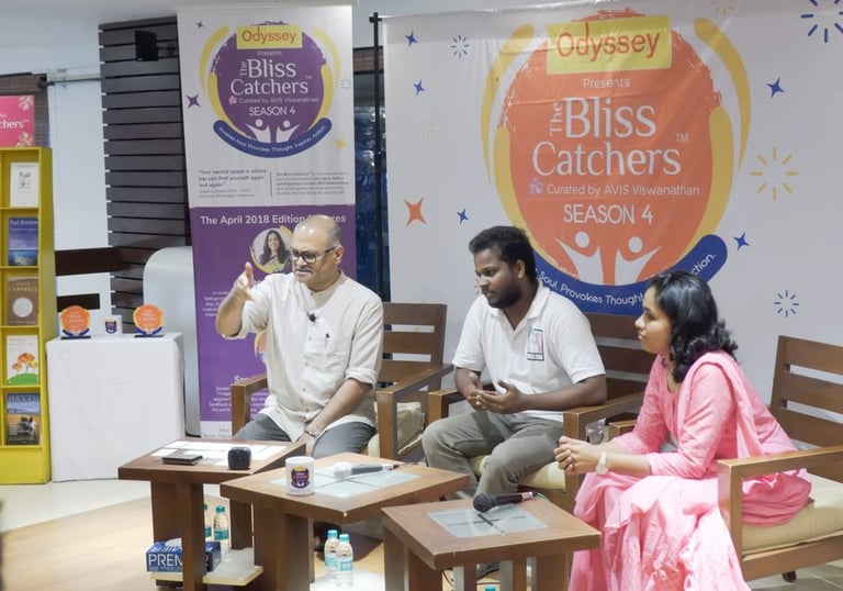 A popular Chennai-based live event series, curated by happiness coach AVIS Viswanathan, featuring conversations with individuals who've successfully followed their passions (their "bliss") instead of traditional paths. Sandhiyan Thilagavathy was featured in Season 4 Edition in April '18