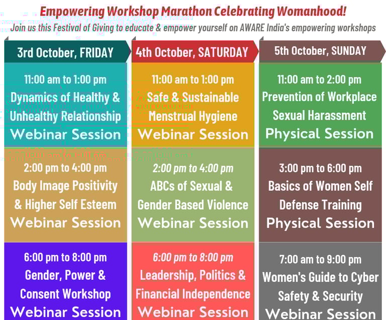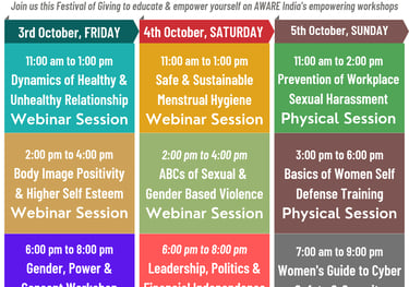 to educate & empower girls and women on AWARE India's empowering workshops that focuses on themes of Navratri including Lust, Anger, Greed, Attachment, Ego, Fear, Jealousy, Inertia, Feel and Guilty.