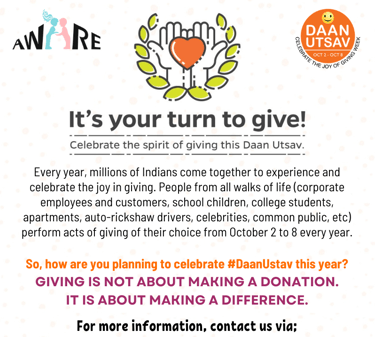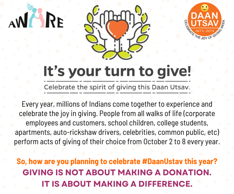 Celebrated every year from October 2 to 8, #DaanUtsav is India’s biggest festival of giving. People come together to celebrate acts of kindness by providing time, resources, or money to the cause(s) they care about. You too can engage those around you to make a difference to many lives in need.