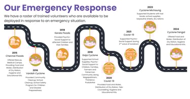 Includes Rescue, First Aid, Medical Camps, Providing Food and Water, Distribution of Dry Ration, Hygiene, Bed, Shelter and Educational Kits.