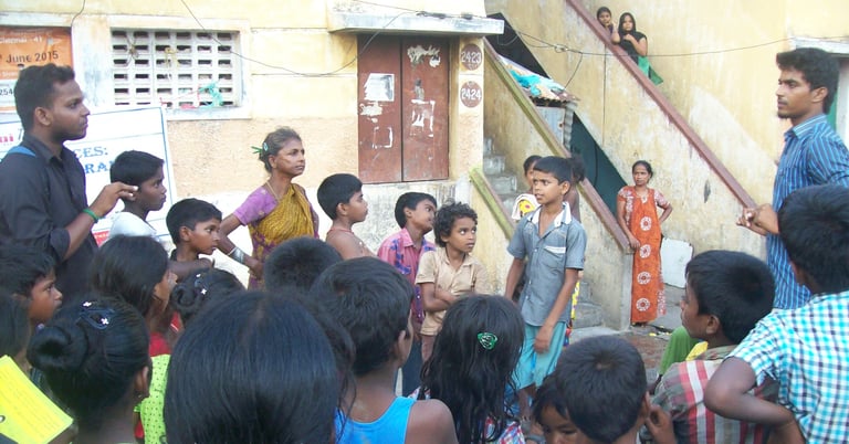 After working for 4 continuous months in trying our best to support the community, we got to learn the community was allocated and slowly moving to Chemmenchery which was then governed by Slum Clearance Housing Board which led us to envision a holistic community development project addressing the core issues that we have chosen to create safe spaces for individuals of different ages. We started our first program as a 5-week campaign on Child Rights & Protection campaign conceptualized with street play, door-door campaign, sticker campaign and signature campaign reaching out to 6700+ households creating visibility on Childline Helpline 1098