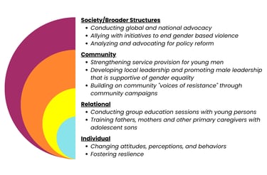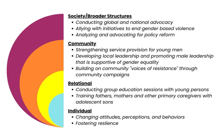 The model emphasizes that to change individual behavior, programs need to not only work with individuals, but to also address the systems and groups—peers, families, communities, media, policies—that influence individuals. It also encourages any of our target groups to think about the: