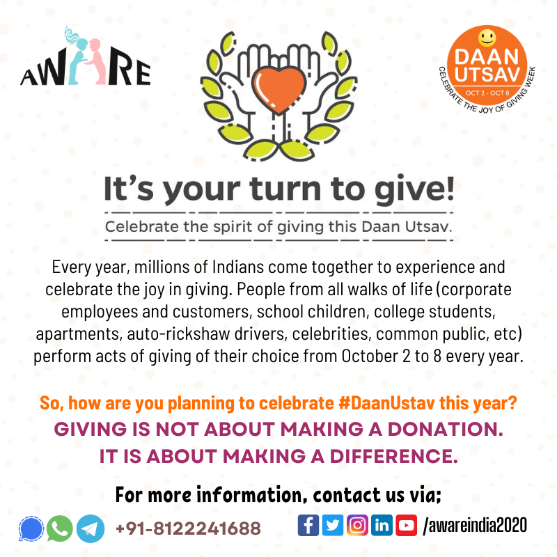 Celebrated every year from October 2 to 8, #DaanUtsav is India’s biggest festival of giving. People come together to celebrate acts of kindness by providing time, resources, or money to the cause(s) they care about. You too can engage those around you to make a difference to many lives in need.