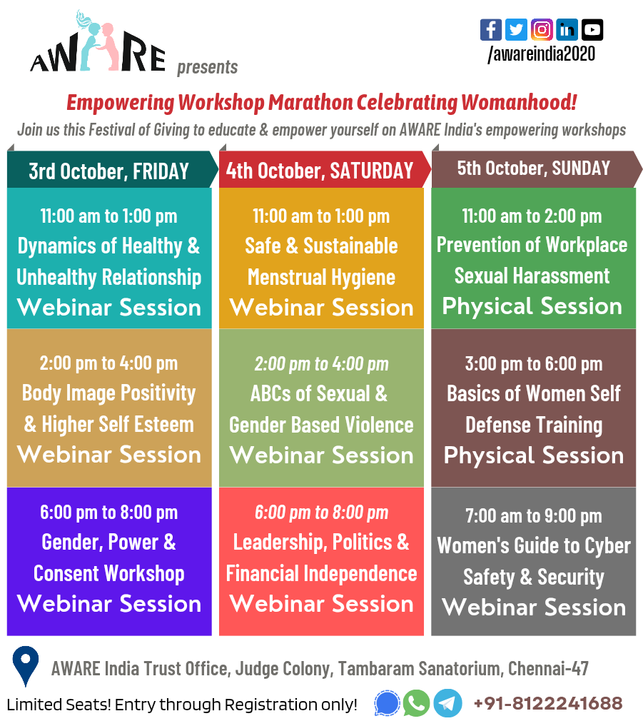 to educate & empower girls and women on AWARE India's empowering workshops that focuses on themes of Navratri including Lust, Anger, Greed, Attachment, Ego, Fear, Jealousy, Inertia, Feel and Guilty.
