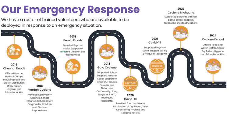 We provide emergency response as part of disaster relief, recovery & preparedness across India. We help children and people to survive and rebuild their lives through food and non-food item support, shelter materials, water, sanitation, hygiene materials and dignity kits, first aid, health and nutrition support. Our efforts are not limited to immediate response; we also work on disaster risk management, anticipatory action protocols, mitigation, recovery, and reconstruction activities to help communities be ready as first responders, prevent loss of lives and livelihoods, and build back better when an emergency strikes. Our most recent interventions in Chennai, Cuddalore, Tiruvallur in Tamilnadu and Kerala have impacted thousands of lives!