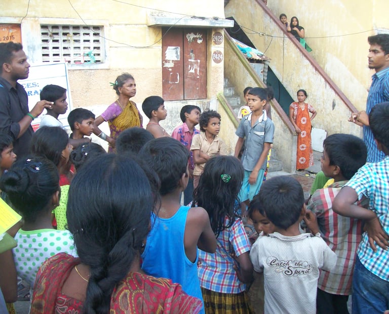 After working for 4 continuous months in trying our best to support the community, we got to learn the community was allocated and slowly moving to Chemmenchery which was then governed by Slum Clearance Housing Board which led us to envision a holistic community development project addressing the core issues that we have chosen to create safe spaces for individuals of different ages. We started our first program as a 5-week campaign on Child Rights & Protection campaign conceptualized with street play, door-door campaign, sticker campaign and signature campaign reaching out to 6700+ households creating visibility on Childline Helpline 1098