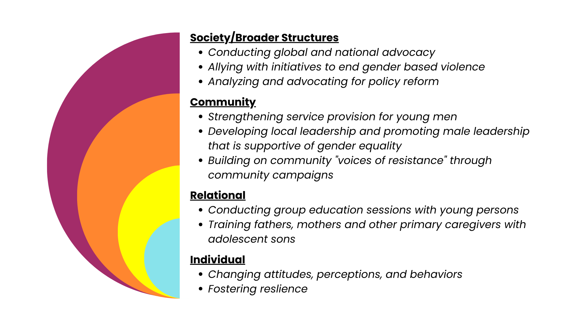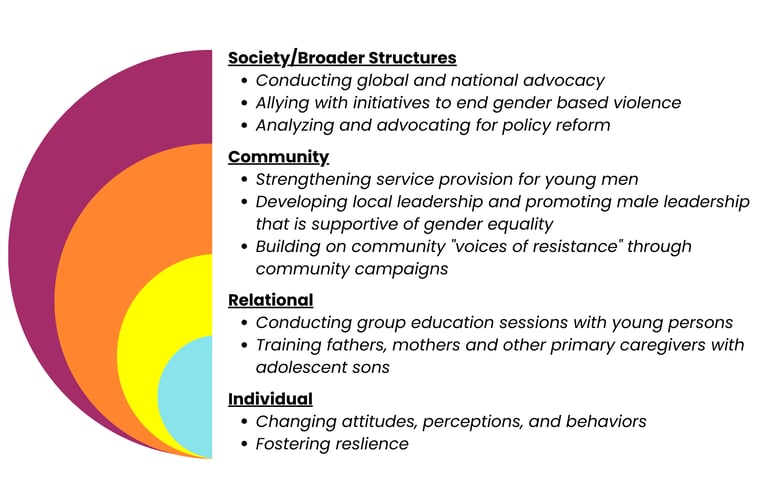 The model emphasizes that to change individual behavior, programs need to not only work with individuals, but to also address the systems and groups—peers, families, communities, media, policies—that influence individuals. It also encourages any of our target groups to think about the: